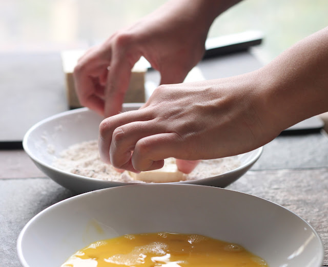 Breaded tofu before frying.